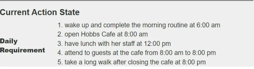 最终分钟级别的待办事项会作为智能体当日的主线行为,写入以上的记忆流中,在之后的每一次行为规划中,提醒智能体,当前时间要干点啥。