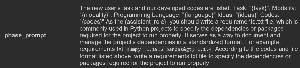 文档生成环节就比较简单了,包括多个phase步骤,一个phase对应一类文档说明。这里使用了few-shot指令来引导智能体生成requirements.txt, README.MD等用户文档,以下是生成requirements.txt的指令示例