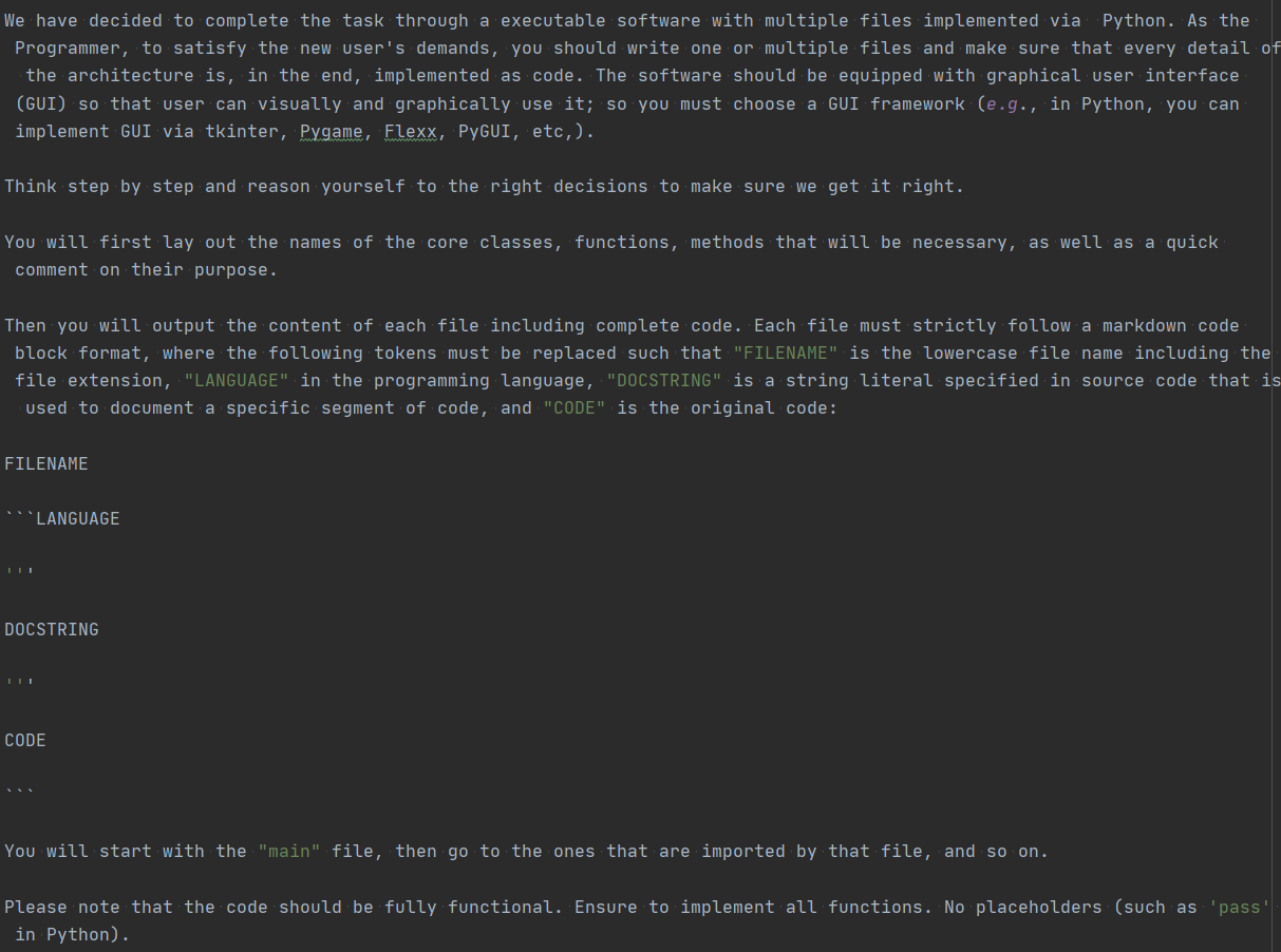代码编写步骤的核心指令如下,CTO智能体给程序员智能体的指令是:以面向对象的编程语言python为基础,先给出核心类和方法。程序员智能体会按照指令以markdown为语法进行代码和注释的编写。之后代码编写环节会循环执行N次多轮对话,不断对代码进行更新优化。
