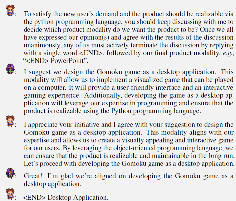 基于初始指令,之后两个智能体会通过对话相互为对方生成指令,而人工参与的部分只有最初的角色描述和任务描述,所以叫初始指令。产品涉及环节的具体指令如下,需求分析阶段的任务指令使用了few-shot,给出不同的产品形态例如图片,文档,应用等实现方式,并明确了对话的两个智能体的讨论主题,以及终止讨论的条件,即确定产品形态